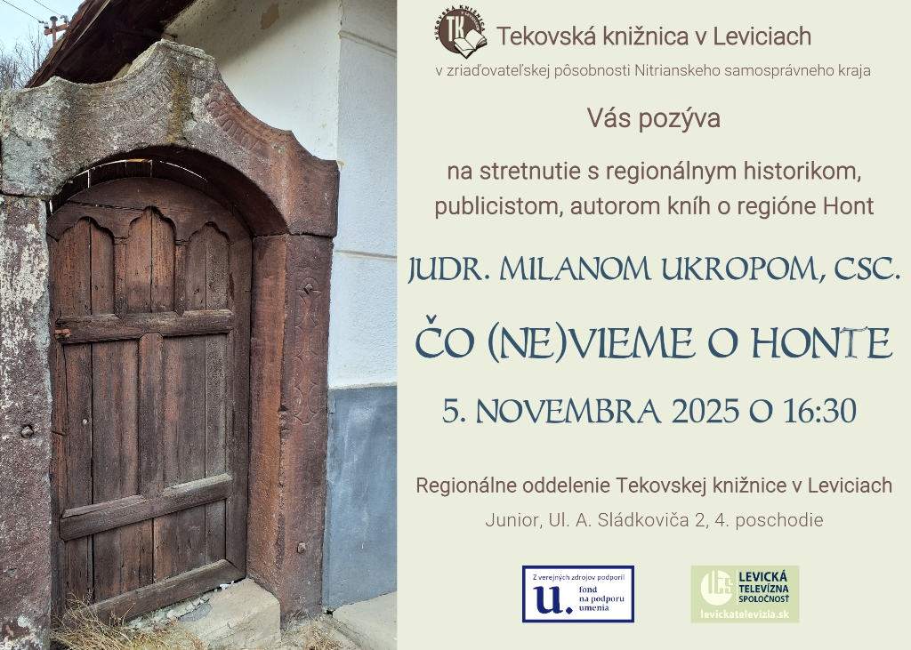 Tešíme sa na vás v stredu 5. novembra 2025 o 16:30 v Regionálnom oddelení Tekovskej knižnice v Leviciach – Junior, Ul. A. Sládkoviča 2, 4. poschodie.