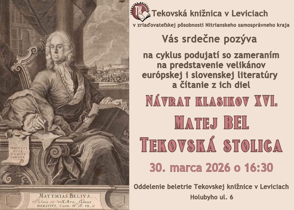 Podujatie sa uskutoční v pondelok 30. marca 2026 o 16.30 hod. v Oddelení beletrie Tekovskej knižnice v Leviciach, Holubyho ul. č. 6.