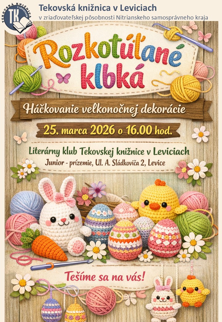 Rozkotúľané klbká srdečne pozývajú priaznivcov ručných prác na pravidelné stretnutie šikovných rúk, ktoré sa uskutoční v stredu 25. marca 2026 o 16.00 hod. v Literárnom klube Tekovskej knižnice v Leviciach (Junior, Ul. A. Sládkoviča 2, prízemie).